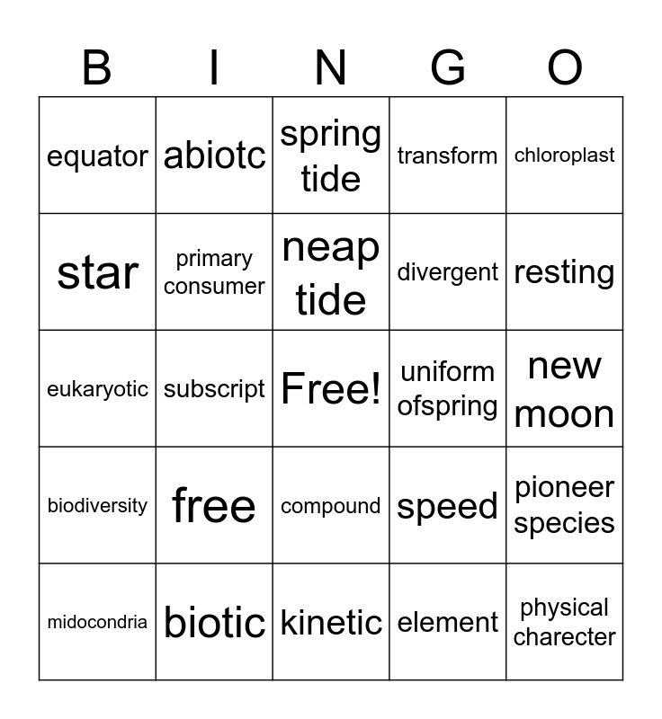 This bingo card has a free space and 24 words: free, biotic, neap tide, midocondria, chloroplast, equator, star, abiotc, uniform ofspring, compound, divergent, eukaryotic, speed, pioneer species, primary consumer, element, new moon, spring tide, resting, subscript, physical charecter, biodiversity, transform and kinetic.