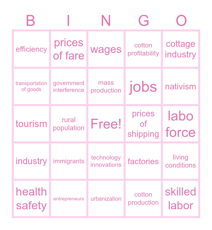 This bingo card has a free space and 24 words: immigrants, entrepreneurs, mass production, health safety, cottage industry, efficiency, transportation of goods, prices of fare, prices of shipping, technology innovations, jobs, tourism, factories, living conditions, government interference, cotton production, labo force, wages, nativism, rural population, skilled labor, industry, cotton profitability and urbanization.