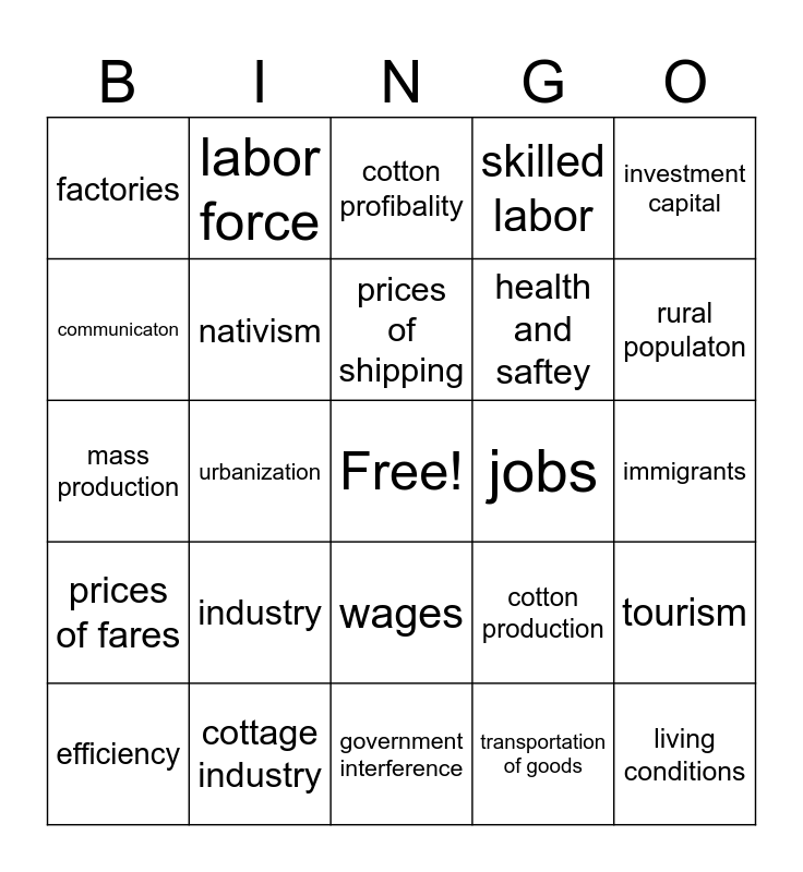 This bingo card has a free space and 24 words: industry, cottage industry, prices of shipping, efficiency, investment capital, factories, communicaton, labor force, jobs, wages, health and saftey, mass production, cotton production, tourism, nativism, transportation of goods, immigrants, cotton profibality, rural populaton, urbanization, living conditions, prices of fares, skilled labor and government interference.