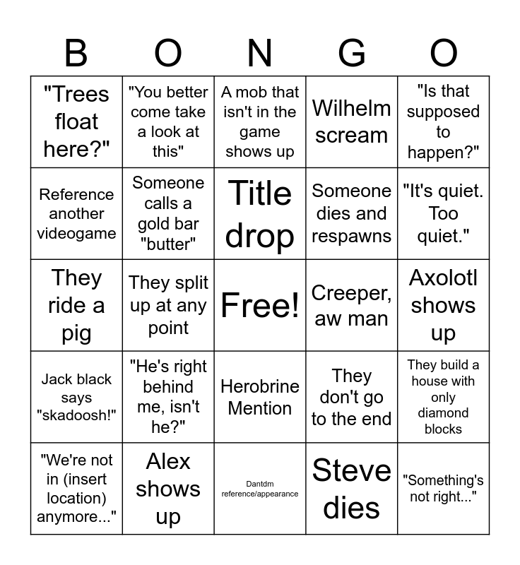 This bingo card has a free space and 24 words: "He's right behind me, isn't he?", Alex shows up, Title drop, "We're not in (insert location) anymore...", "Is that supposed to happen?", "Trees float here?", Reference another videogame, "You better come take a look at this", Creeper, aw man, Herobrine Mention, Someone dies and respawns, They ride a pig, They don't go to the end, They build a house with only diamond blocks, Someone calls a gold bar "butter", Steve dies, Axolotl shows up, A mob that isn't in the game shows up, "It's quiet. Too quiet.", They split up at any point, "Something's not right...", Jack black says "skadoosh!", Wilhelm scream and Dantdm reference/appearance.