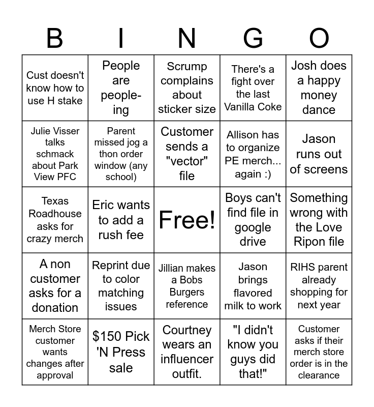 This bingo card has a free space and 29 words: Merch Store customer wants changes after approval, Customer doesn't understand logo release fees, Eric wants to add a rush fee, Taylor says "That's not how we do business", Cust doesn't know how to use H stake, Scrump complains about sticker size, Parent missed jog a thon order window (any school), Reprint due to color matching issues, Boys can't find file in google drive, $150 Pick 'N Press sale, Something wrong with the Love Ripon file, Customer asks if their merch store order is in the clearance, Courtney wears an influencer outfit., "I didn't know you guys did that!", Jason runs out of screens, Grad sign customer can't figure out how to send photo, Jillian makes a Bobs Burgers reference, A non customer asks for a donation, Josh does a happy money dance, Texas Roadhouse asks for crazy merch, Jason brings flavored milk to work, Hannah buys ANOTHER beige item, Allison has to organize PE merch... again :), Julie Visser talks schmack about Park View PFC, There's a fight over the last Vanilla Coke, People are people-ing, RIHS parent already shopping for next year, Customer sends a "vector" file and Taylor tells Eric to "garbage in, garbage out" the file.