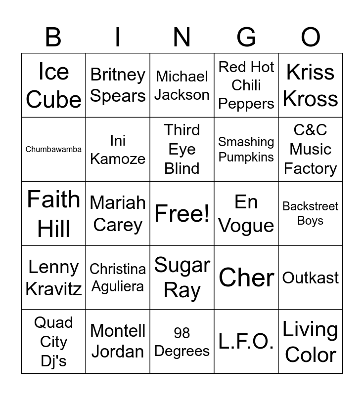 This bingo card has a free space and 35 words: P.M. Dawn, E.M.F., Shaggy, Ini Kamoze, Sugar Ray, Red Hot Chili Peppers, Chumbawamba, Hootie & The Blowfish, Third Eye Blind, Hanson, Faith Hill, Kriss Kross, MC Hammer, Naughty By Nature, Ice Cube, En Vogue, L.F.O., Mariah Carey, Lenny Kravitz, Living Color, Cher, Quad City Dj's, Outkast, Montell Jordan, Michael Jackson, C&C Music Factory, Lit, Bell Biv DeVoe, Smashing Pumpkins, Backstreet Boys, Spice Girls, 98 Degrees, Christina Aguliera, Britney Spears and Digital Underground.