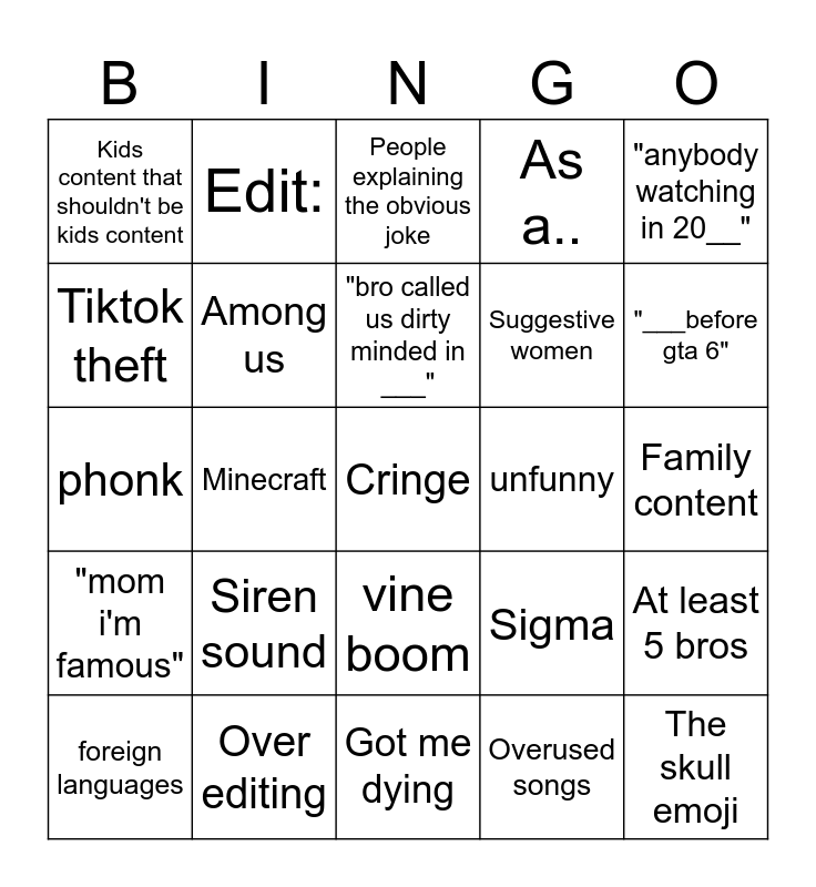 This bingo card has a free space and 24 words: Siren sound, Over editing, "bro called us dirty minded in ___", foreign languages, "anybody watching in 20__", Kids content that shouldn't be kids content, Tiktok theft, Edit:, unfunny, vine boom, Suggestive women, phonk, Sigma, At least 5 bros, Among us, Overused songs, Family content, People explaining the obvious joke, "___before gta 6", Minecraft, The skull emoji, "mom i'm famous", As a.. and Got me dying.