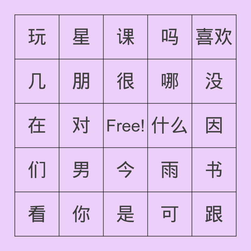 This bingo card has a free space and 58 words: 我, 你, 好, 们, 可, 以, 朋, 的, 哪, 这, 吗, 要, 面, 他, 她, 玩, 跟, 喜欢, 吃, 很, 什么, 课, 看, 书, 老, 因, 为, 有, 没, 外, 雪, 说, 给, 妈, 爸, 前, 后, 对, 在, 里, 男, 女, 雨, 土, 月, 天, 生, 今, 是, 明, 昨, 走, 去, 来, 星, 期, 几 and 年.