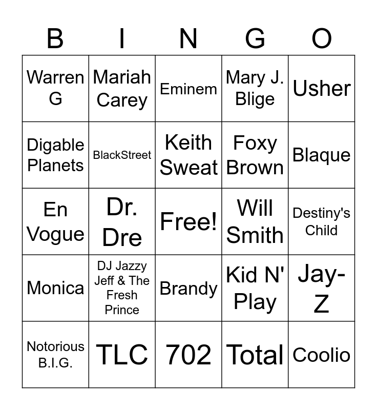 This bingo card has a free space and 29 words: Notorious B.I.G., Tupac, Dr. Dre, Snoop Dogg, Warren G, Eminem, BlackStreet, DJ Jazzy Jeff & The Fresh Prince, Will Smith, TLC, Destiny's Child, Coolio, 702, Total, Blaque, Nas, Brandy, Monica, Usher, En Vogue, Kid N' Play, SWV, Foxy Brown, Digable Planets, Mary J. Blige, Mariah Carey, Jay-Z, Keith Sweat and Big Pun.