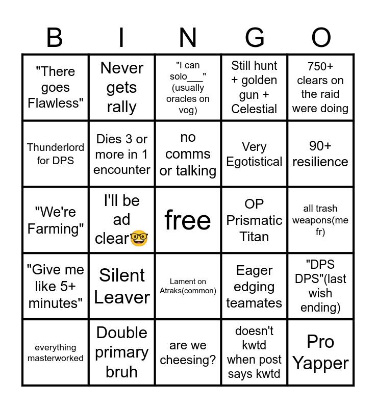 This bingo card has a free space and 24 words: Silent Leaver, Double primary bruh, no comms or talking, everything masterworked, 750+ clears on the raid were doing, "There goes Flawless", Thunderlord for DPS, Never gets rally, OP Prismatic Titan, Lament on Atraks(common), Very Egotistical, "We're Farming", Eager edging teamates, "DPS DPS"(last wish ending), Dies 3 or more in 1 encounter, doesn't kwtd when post says kwtd, all trash weapons(me fr), "I can solo___"(usually oracles on vog), 90+ resilience, I'll be ad clear🤓, Pro Yapper, "Give me like 5+ minutes", Still hunt + golden gun + Celestial and are we cheesing?.