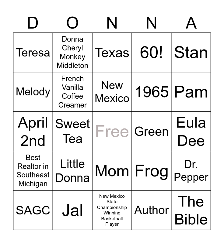 This bingo card has a free space and 24 words: Little Donna, Jal, New Mexico, SAGC, Stan, Teresa, Melody, Donna Cheryl Monkey Middleton, Green, Mom, 1965, April 2nd, Frog, Dr. Pepper, French Vanilla Coffee Creamer, Author, Eula Dee, Texas, Pam, Sweet Tea, The Bible, Best Realtor in Southeast Michigan, 60! and New Mexico State Championship Winning Basketball Player.