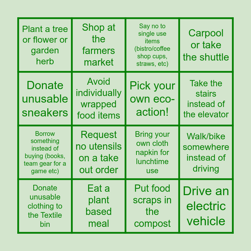 This bingo card has 16 words: Donate unusable clothing to the Textile bin, Eat a plant based meal, Say no to single use items (bistro/coffee shop cups, straws, etc), Carpool or take the shuttle, Donate unusable sneakers, Shop at the farmers market, Bring your own cloth napkin for lunchtime use, Walk/bike somewhere instead of driving, Plant a tree or flower or garden herb, Avoid individually wrapped food items, Put food scraps in the compost, Take the stairs instead of the elevator, Borrow something instead of buying (books, team gear for a game etc), Request no utensils on a take out order, Pick your own eco-action! and Drive an electric vehicle.