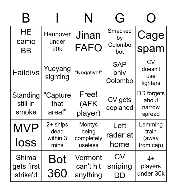 This bingo card has a free space and 24 words: 2+ ships dead within 3 mins, Bot 360, "Negative!", Shima gets first strike'd, Cage spam, HE camo BB, Faildivs, Hannover under 20k, CV gets deplaned, Montys being completely useless, SAP only Colombo, Standing still in smoke, Left radar at home, Lemming train (away from cap), Yueyang sighting, CV sniping DD, DD forgets about narrow spread, Jinan FAFO, CV doesn't use fighters, "Capture that area!", 4+ players under 30k, MVP loss, Smacked by Colombo bot and Vermont can't hit anything.