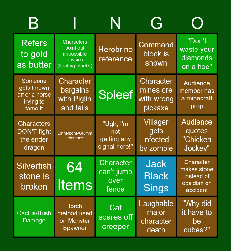 This bingo card has 25 words: 64 Items, Cat scares off creeper, Spleef, Cactus/Bush Damage, "Don't waste your diamonds on a hoe", Refers to gold as butter, Someone gets thrown off of a horse trying to tame it, Characters point out impossible physics (floating blocks), Villager gets infected by zombie, Character can't jump over fence, Character mines ore with wrong pickaxe, Characters DON'T fight the ender dragon, Jack Black Sings, Character makes stone instead of obsidian on accident, Character bargains with Piglin and fails, "Why did it have to be cubes?", Audience quotes "Chicken Jockey", Herobrine reference, Audience member has a minecraft prop, Dinnerbone/Grumm reference, "Ugh, I'm not getting any signal here!", Torch method used on Monster Spawner, Silverfish stone is broken, Command block is shown and Laughable major character death.