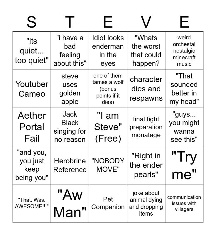 This bingo card has a free space and 24 words: Herobrine Reference, "Aw Man", one of them tames a wolf (bonus points if it dies), "That. Was. AWESOME!!!", weird orchestal nostalgic minecraft music, "its quiet... too quiet", Youtuber Cameo, "i have a bad feeling about this", final fight preparation monatage, "NOBODY MOVE", character dies and respawns, Aether Portal Fail, "Right in the ender pearls", "Try me", steve uses golden apple, joke about animal dying and dropping items, "guys... you might wanna see this", Idiot looks enderman in the eyes, "That sounded better in my head", Jack Black singing for no reason, communication issues with villagers, "and you, you just keep being you", "Whats the worst that could happen? and Pet Companion.