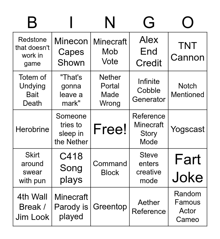 This bingo card has a free space and 24 words: 4th Wall Break / Jim Look, C418 Song plays, Nether Portal Made Wrong, Aether Reference, TNT Cannon, Redstone that doesn't work in game, Minecon Capes Shown, Minecraft Mob Vote, Reference Minecraft Story Mode, Yogscast, Herobrine, "That's gonna leave a mark", Steve enters creative mode, Fart Joke, Totem of Undying Bait Death, Minecraft Parody is played, Greentop, Alex End Credit, Notch Mentioned, Skirt around swear with pun, Someone tries to sleep in the Nether, Command Block, Infinite Cobble Generator and Random Famous Actor Cameo.