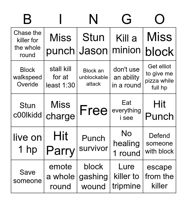 This bingo card has a free space and 24 words: Hit Parry, emote a whole round, Block an unblockable attack, Save someone, Miss block, Chase the killer for the whole round, Block walkspeed Overide, Miss punch, Eat everything i see, Punch survivor, don't use an ability in a round, Stun c00lkidd, No healing 1 round, Defend someone with block, stall kill for at least 1:30, Lure killer to tripmine, Hit Punch, Stun Jason, Get elliot to give me pizza while full hp, Miss charge, escape from the killer, live on 1 hp, Kill a minion and block gashing wound.