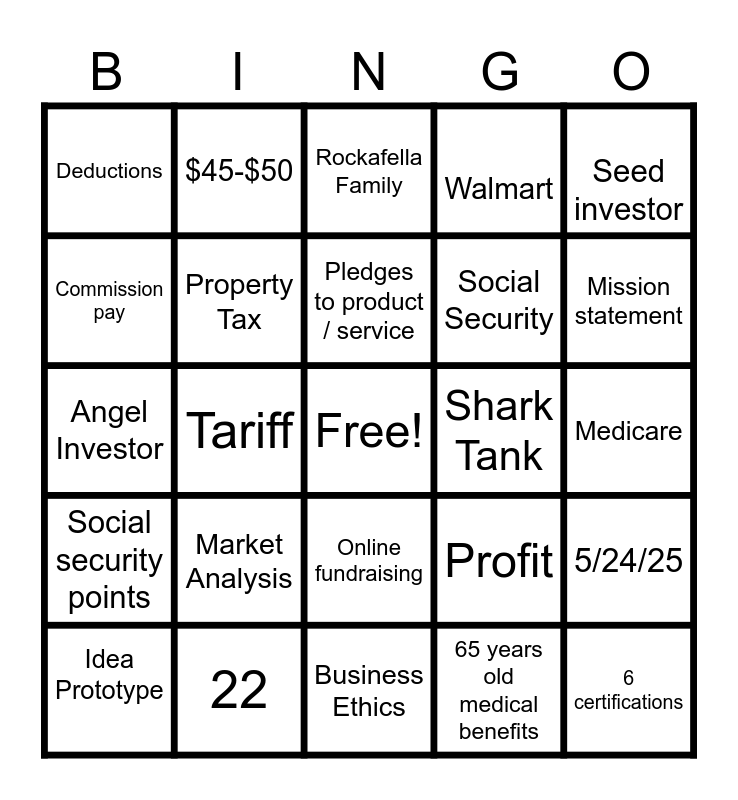 This bingo card has 1 images, a free space and 24 words: Market Analysis, 22, Pledges to product / service, Idea Prototype, Seed investor, Deductions, Commission pay, $45-$50, Shark Tank, Online fundraising, Social Security, Angel Investor, Profit, 5/24/25, Property Tax, 65 years old medical benefits, Medicare, Rockafella Family, Mission statement, Tariff, 6 certifications, Social security points, Walmart and Business Ethics.