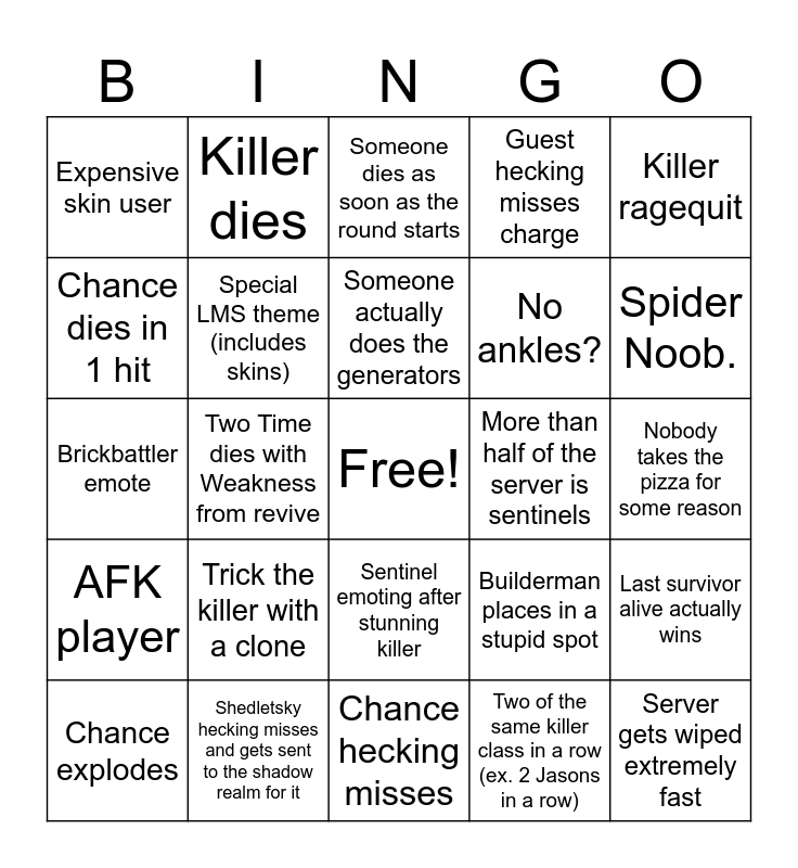 This bingo card has a free space and 24 words: Trick the killer with a clone, Shedletsky hecking misses and gets sent to the shadow realm for it, Someone actually does the generators, Chance explodes, Killer ragequit, Expensive skin user, Chance dies in 1 hit, Killer dies, More than half of the server is sentinels, Sentinel emoting after stunning killer, No ankles?, Brickbattler emote, Builderman places in a stupid spot, Last survivor alive actually wins, Special LMS theme (includes skins), Two of the same killer class in a row (ex. 2 Jasons in a row), Nobody takes the pizza for some reason, Someone dies as soon as the round starts, Spider Noob., Two Time dies with Weakness from revive, Server gets wiped extremely fast, AFK player, Guest hecking misses charge and Chance hecking misses.
