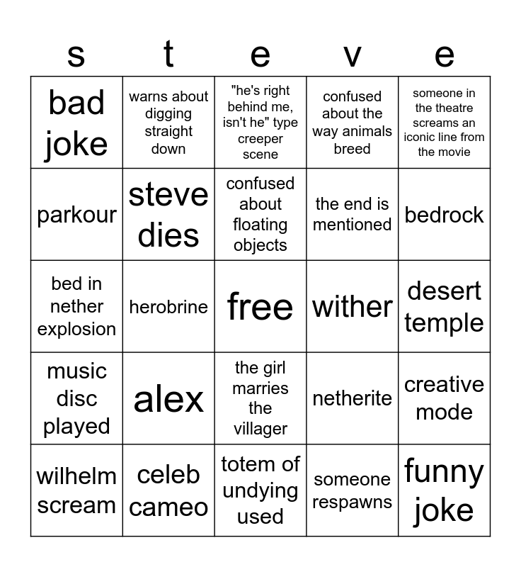 This bingo card has a free space and 24 words: alex, celeb cameo, confused about floating objects, wilhelm scream, someone in the theatre screams an iconic line from the movie, bad joke, parkour, warns about digging straight down, wither, the girl marries the villager, the end is mentioned, bed in nether explosion, netherite, creative mode, steve dies, someone respawns, desert temple, "he's right behind me, isn't he" type creeper scene, bedrock, herobrine, funny joke, music disc played, confused about the way animals breed and totem of undying used.