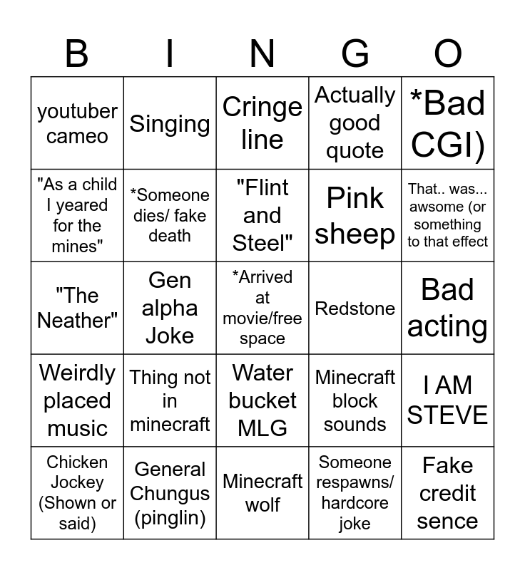 This bingo card has a free space and 24 words: Thing not in minecraft, General Chungus (pinglin), "Flint and Steel", Chicken Jockey (Shown or said), *Bad CGI), youtuber cameo, "As a child I yeared for the mines", Singing, Redstone, Water bucket MLG, Pink sheep, "The Neather", Minecraft block sounds, I AM STEVE, *Someone dies/ fake death, Someone respawns/ hardcore joke, Bad acting, Cringe line, That.. was... awsome (or something to that effect, Gen alpha Joke, Fake credit sence, Weirdly placed music, Actually good quote and Minecraft wolf.