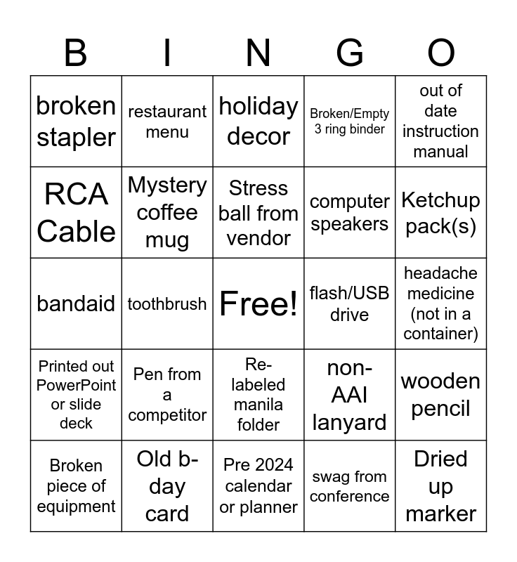 This bingo card has a free space and 24 words: Broken piece of equipment, Pen from a competitor, Stress ball from vendor, swag from conference, out of date instruction manual, broken stapler, restaurant menu, holiday decor, flash/USB drive, headache medicine (not in a container), bandaid, Mystery coffee mug, non-AAI lanyard, wooden pencil, RCA Cable, Old b-day card, Pre 2024 calendar or planner, Broken/Empty 3 ring binder, Ketchup pack(s), Printed out PowerPoint or slide deck, toothbrush, Re-labeled manila folder, computer speakers and Dried up marker.
