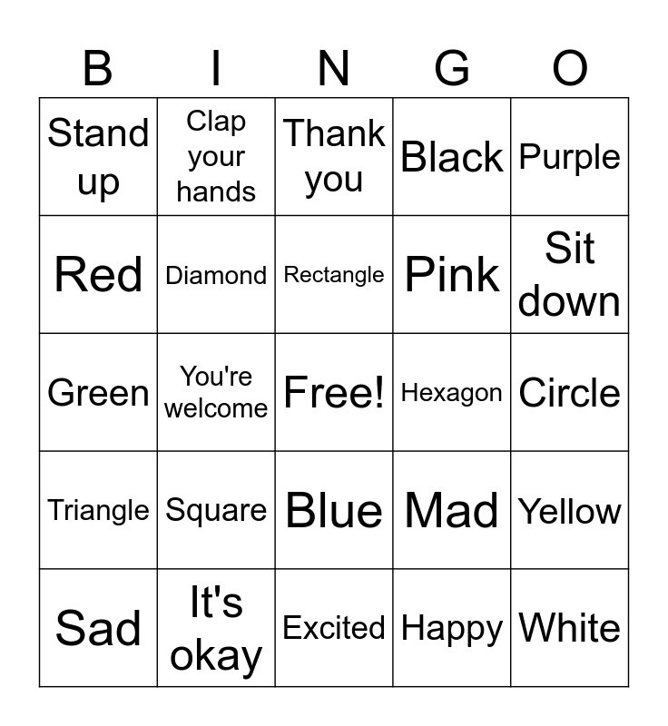 This bingo card has a free space and 24 words: Square, It's okay, Rectangle, Sad, Purple, Stand up, Red, Clap your hands, Hexagon, Blue, Pink, Green, Mad, Yellow, Diamond, Happy, Circle, Thank you, Sit down, You're welcome, White, Triangle, Black and Excited.