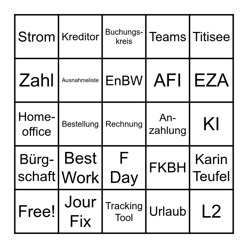 This bingo card has 27 words: FKBH, L2, AFI, Tracking Tool, Zahl, Buchungs-kreis, Kreditor, Bürg-schaft, An-zahlung, Karin Teufel, Home-office, Teams, Free!, Jour Fix, EZA, Finanzen, Ausnahmeliste, EnBW, Best Work, Strom, KI, Urlaub, Bestellung, Rechnung, F Day, Titisee and Skonto.
