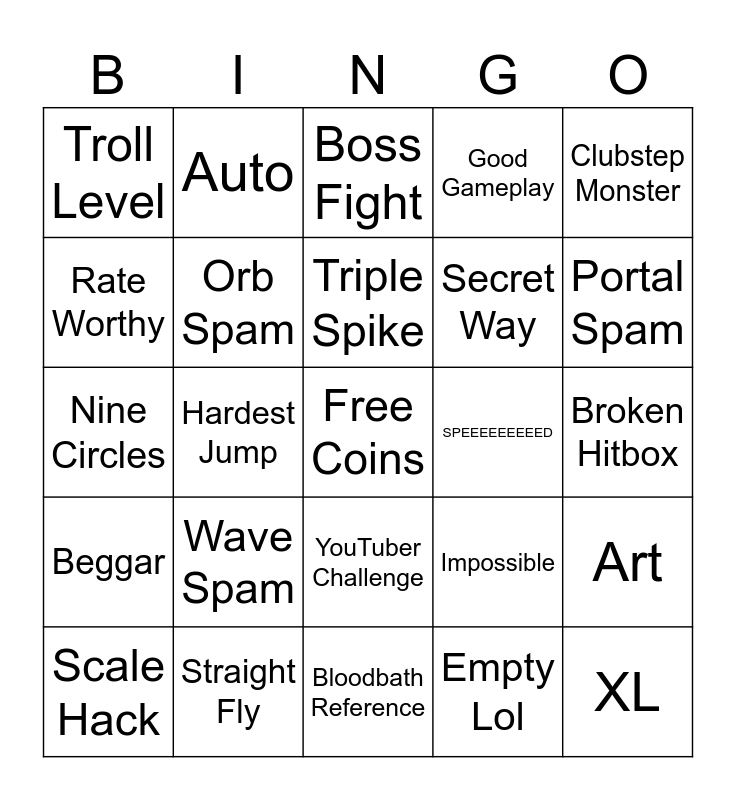 This bingo card has a free space and 24 words: Wave Spam, Straight Fly, Triple Spike, Scale Hack, Clubstep Monster, Troll Level, Rate Worthy, Auto, SPEEEEEEEEED, YouTuber Challenge, Secret Way, Nine Circles, Impossible, Art, Orb Spam, Empty Lol, Broken Hitbox, Boss Fight, Portal Spam, Hardest Jump, XL, Beggar, Good Gameplay and Bloodbath Reference.