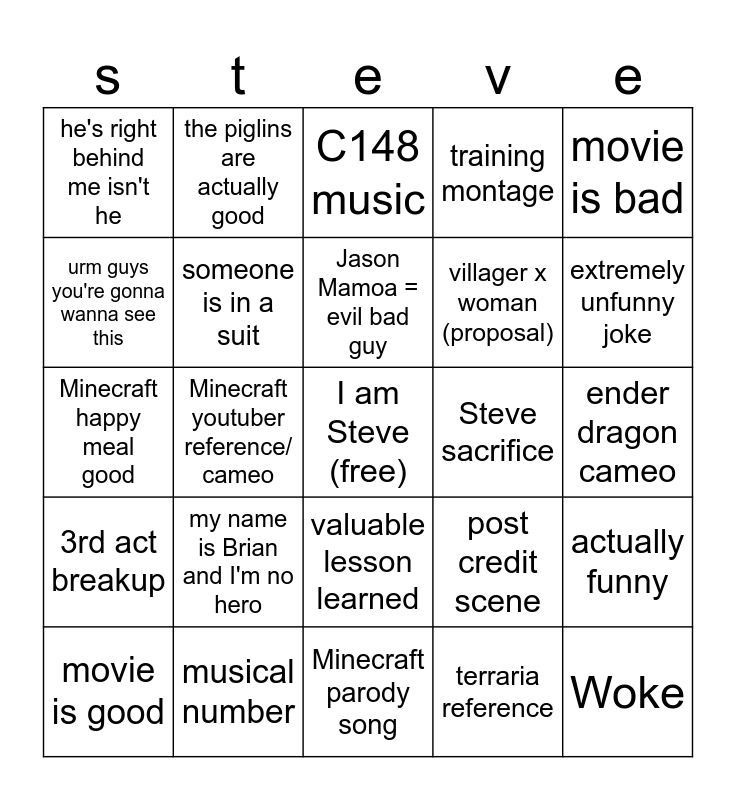 This bingo card has a free space and 24 words: my name is Brian and I'm no hero, musical number, Jason Mamoa = evil bad guy, movie is good, movie is bad, he's right behind me isn't he, urm guys you're gonna wanna see this, the piglins are actually good, Steve sacrifice, valuable lesson learned, villager x woman (proposal), Minecraft happy meal good, post credit scene, actually funny, someone is in a suit, terraria reference, ender dragon cameo, C148 music, extremely unfunny joke, Minecraft youtuber reference/ cameo, Woke, 3rd act breakup, training montage and Minecraft parody song.