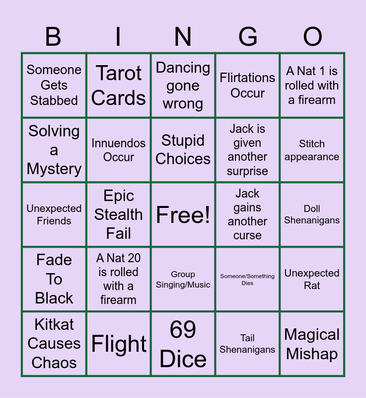 This bingo card has a free space and 39 words: Patch appearance, Backstory Reveals, One of the brothers is hurt, Innuendos Occur, Kitkat Causes Chaos, Group Singing/Music, Stupid Choices, Mispronounce/typo, A Nat 1 is rolled with a firearm, Fade To Black, Epic Stealth Fail, Flirtations Occur, Magical Mishap, Doll Shenanigans, Jack gains another curse, A Nat 20 is rolled with a firearm, Character Bondage- I mean Bonding, Someone Gets Stabbed, Match appearance, Someone/Something Dies, Solving a Mystery, 69 Dice, Jack is given another surprise, Stitch appearance, Someone gets Kidnapped, Someone gets Hugged, Someone gets Yeeted, Someone gains new creature type, Mimic Surprise, Tarot Cards, Magician Appearance, Commander Appearance, Dancing gone wrong, Flight, Tail Shenanigans, Charlie Appearance, Unexpected Rat, Unexpected Friends and Exploration Shenanigans.