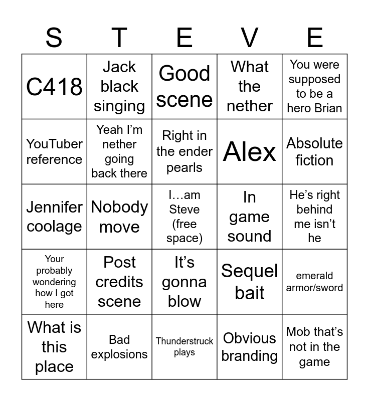 This bingo card has a free space and 39 words: Guy you need to see this, Random montage, This is a…, Yeah I’m nether going back there, What is this place, It’s gonna blow, Right in the ender pearls, Bad redstone, You were supposed to be a hero Brian, Your probably wondering how I got here, Nobody move, What the nether, Mob that’s not in the game, He’s right behind me isn’t he, In game sound, Post credits scene, Cringe joke/dance, C418, Random screaming, Sequel bait, YouTuber reference, Thunderstruck plays, Alex, Absolute fiction, One of the piglins helps the hero, Run I’ll hold them off, Game accurate, Actually funny joke, Maybe Minecraft was the friends we made along the way, Jack black singing, Bad crafting, Pun, Good scene, Bad explosions, Obvious branding, Movie reference, emerald armor/sword, Jennifer coolage and pet animal.