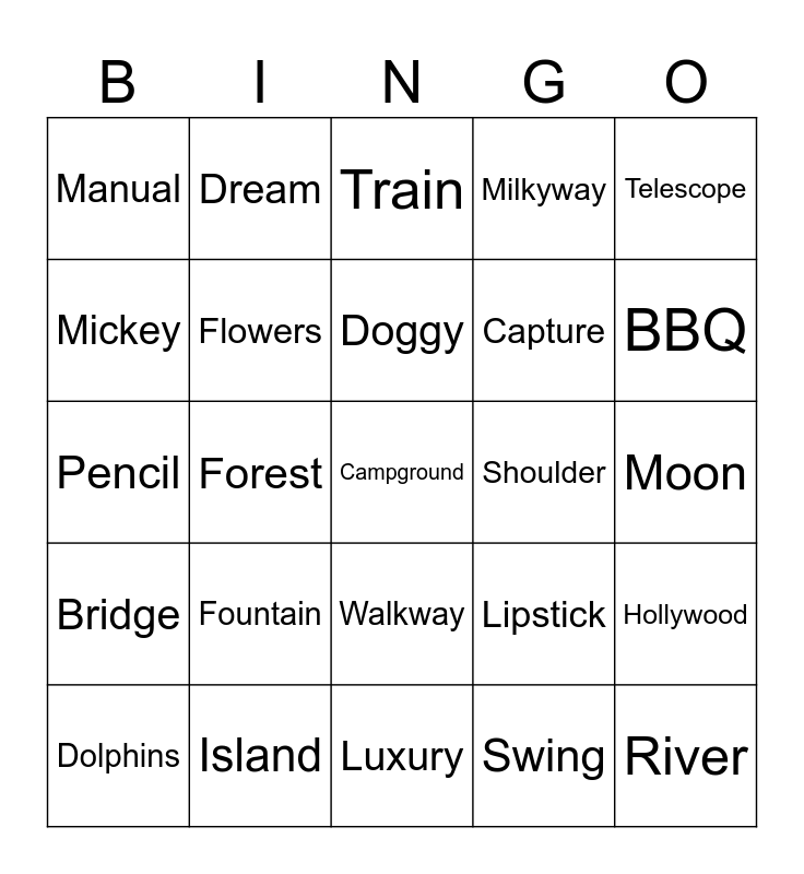 This bingo card has 25 words: Fountain, Luxury, Doggy, Dolphins, Telescope, Manual, Mickey, Dream, Shoulder, Walkway, Capture, Pencil, Lipstick, Hollywood, Flowers, River, Moon, Train, BBQ, Forest, Campground, Island, Bridge, Milkyway and Swing.
