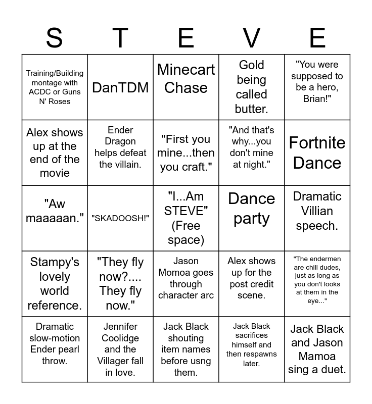 This bingo card has a free space and 24 words: "They fly now?.... They fly now.", Jennifer Coolidge and the Villager fall in love., "First you mine...then you craft.", Dramatic slow-motion Ender pearl throw., "You were supposed to be a hero, Brian!", Training/Building montage with ACDC or Guns N' Roses, Alex shows up at the end of the movie, DanTDM, Dance party, Jason Momoa goes through character arc, "And that's why...you don't mine at night.", "Aw maaaaan.", Alex shows up for the post credit scene., "The endermen are chill dudes, just as long as you don't looks at them in the eye...", Ender Dragon helps defeat the villain., Jack Black sacrifices himself and then respawns later., Dramatic Villian speech., Minecart Chase, Fortnite Dance, "SKADOOSH!", Jack Black and Jason Mamoa sing a duet., Stampy's lovely world reference., Gold being called butter. and Jack Black shouting item names before usng them..