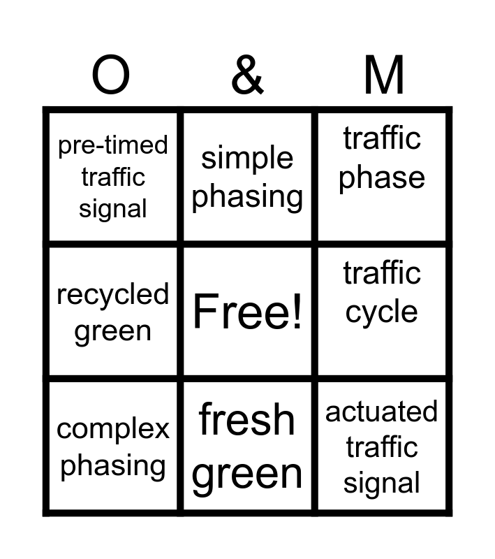 This bingo card has a free space and 8 words: traffic cycle, traffic phase, simple phasing, complex phasing, pre-timed traffic signal, actuated traffic signal, recycled green and fresh green.