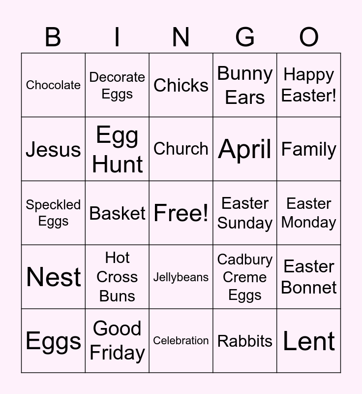 This bingo card has a free space and 29 words: Eggs, Bunny, Basket, Holiday, Chocolate, Chicks, Egg Hunt, Hot Cross Buns, Easter Sunday, Good Friday, Easter Monday, Lent, Celebration, Rabbits, Family, Carrots, Jellybeans, Nest, Happy Easter!, Speckled Eggs, Cadbury Creme Eggs, Fun, April, Jesus, Bunny Ears, Decorate Eggs, Easter Bonnet, Church and Joy.