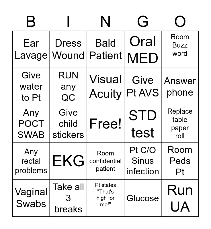 This bingo card has a free space and 44 words: Scan to packing list, Run UA, Write comment card for Coworker, Vaginal Swabs, Triage 2+, Glucose, Bald Patient, Blood Draw, Room Buzz word, Take all 3 breaks, Oral MED, STD test, Room confidential patient, EKG, Schedule XRAY, Pt states "That's high for me!", Pregnancy test, Any POCT SWAB, Pt W/ Ponytail, Answer phone, Dress Wound, Clean wound, Turn in 5 bins, Ear Lavage, IM Injection, Replace table paper roll, Room WC, Collect any culture, Pt C/O Sinus infection, Any rectal problems, Nurse Visit, Room Peds Pt, Room 80+, SPLINT, Give child stickers, *Bonus FREE SPOT*, CALL ED, Pt has red hair, Visual Acuity, Give water to Pt, Give Pt AVS, Sterile Set UP, RUN any QC and Warm up FLU for someone else.