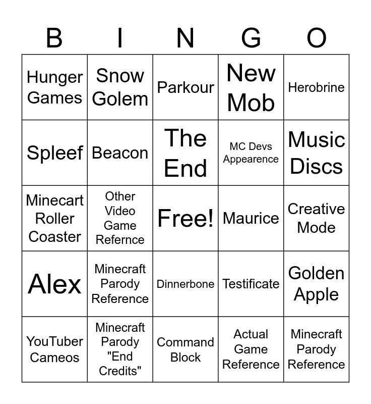 This bingo card has a free space and 24 words: Minecraft Parody Reference, Minecraft Parody "End Credits", The End, YouTuber Cameos, Herobrine, Hunger Games, Spleef, Snow Golem, Maurice, Dinnerbone, MC Devs Appearence, Minecart Roller Coaster, Testificate, Golden Apple, Beacon, Actual Game Reference, Creative Mode, Parkour, Music Discs, Other Video Game Refernce, Minecraft Parody Reference, Alex, New Mob and Command Block.
