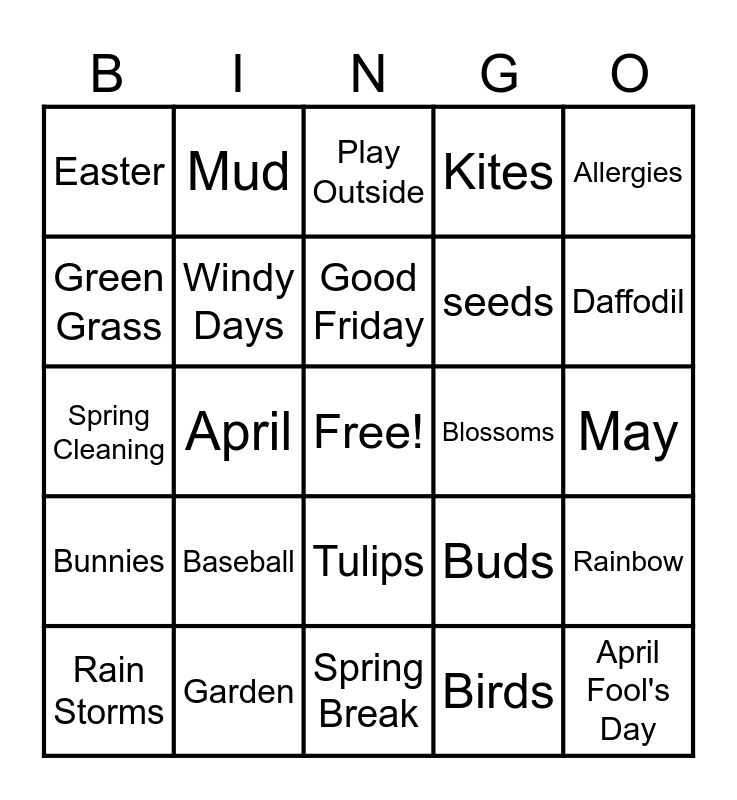 This bingo card has a free space and 29 words: Rain Storms, Kickball, April, Egg Hunt, Easter, Play Outside, Windy Days, Baseball, Blossoms, Garden, May, April Fool's Day, Spring Break, Birds, Daffodil, Pollen, Tulips, Bunnies, Allergies, Spring Cleaning, Buds, Baby Animals, seeds, Green Grass, Kites, Mud, Rainbow, Good Friday and Umbrella.