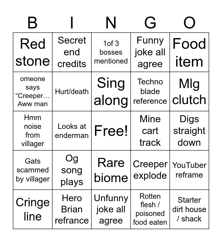 This bingo card has a free space and 24 words: Og song plays, Hero Brian refrance, Sing along, Cringe line, Food item, Red stone, omeone says “Creeper… Aww man, Secret end credits, Mine cart track, Rare biome, Techno blade reference, Hmm noise from villager, Creeper explode, YouTuber reframe, Hurt/death, Rotten flesh / poisoned food eaten, Digs straight down, 1of 3 bosses mentioned, Mlg clutch, Looks at enderman, Starter dirt house / shack, Gats scammed by villager, Funny joke all agree and Unfunny joke all agree.