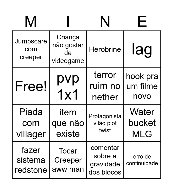 This bingo card has 16 words: Tocar Creeper aww man, Water bucket MLG, Herobrine, Jumpscare com creeper, Piada com villager, Criança não gostar de videogame, Protagonista vilão plot twist, comentar sobre a gravidade dos blocos, Free!, pvp 1x1, fazer sistema redstone, lag, item que não existe, hook pra um filme novo, terror ruim no nether and erro de continuidade.