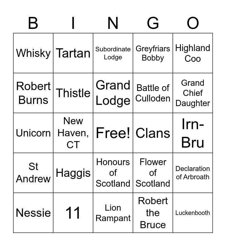 This bingo card has a free space and 33 words: Victoria #1, June 1895, New Haven, CT, Saltire, St Andrew, Thistle, Highland Coo, Nessie, Tartan, Kilt, Grand Lodge, Subordinate Lodge, 5, 29, Clans, Grand Chief Daughter, 11, Unicorn, Haggis, Flower of Scotland, Honours of Scotland, Stone of Destiny, Whisky, Irn-Bru, Lion Rampant, Luckenbooth, Greyfriars Bobby, Battle of Culloden, Robert Burns, Declaration of Arbroath, William Wallace, Robert the Bruce and The Proclaimers.