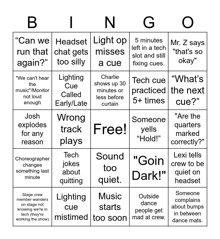 This bingo card has a free space and 30 words: Lighting cue mistimed, Haze Machine Overload, Wrong track plays, “Take it from the top!”, “Can we run that again?”, Light op misses a cue, Lighting Cue Called Early/Late, Sound too quiet., Someone yells “Hold!”, Music starts too soon, "Are the quarters marked correctly?", Someone complains about bumps in between dance mats., Outside dance people get mad at crew., Costume malfunction, “What’s the next cue?”, Unexpected blackout, "Goin Dark!", Choreographer changes something last minute, Tech jokes about quitting, Mr. Z says "that's so okay", Josh explodes for any reason, Assistant stage manager improvises, Headset chat gets too silly, Tech cue practiced 5+ times, "We can't hear the music"/Monitor not loud enough, 5 minutes left in a tech slot and still fixing cues., Lexi tells crew to be quiet on headset, Stage crew member wanders on stage not knowing we're in tech (they're working the show), Charlie shows up 30 minutes or less before curtain and Person giving pre-show speech on stage has no idea what is going on when their cue is given..