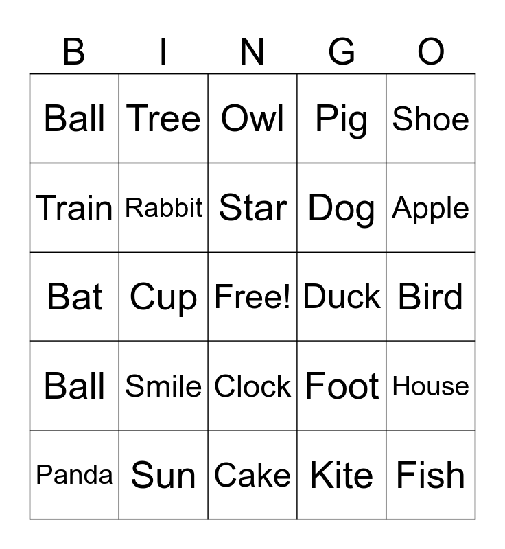 This bingo card has a free space and 25 words: Smile, Cake, Star, Panda, Shoe, Ball, Train, Tree, Duck, Clock, Dog, Bat, Foot, House, Rabbit, Cat, Bird, Owl, Apple, Cup, Fish, Sun, Ball, Pig and Kite.
