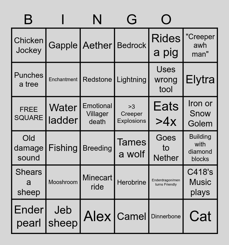 This bingo card has 36 words: Herobrine, Minecart ride, Camel, Punches a tree, Old damage sound, >3 Creeper Explosions, Enchantment, Alex, Rides a pig, Enderdragon/men turns Friendly, Elytra, Bedrock, C418's Music plays, Water ladder, Lightning, Chicken Jockey, Shears a sheep, Eats >4x, FREE SQUARE, Aether, Emotional Villager death, Fishing, Tames a wolf, Breeding, Goes to Nether, Gapple, Uses wrong tool, Jeb sheep, Redstone, "Creeper awh man", Cat, Ender pearl, Building with diamond blocks, Iron or Snow Golem, Mooshroom and Dinnerbone.