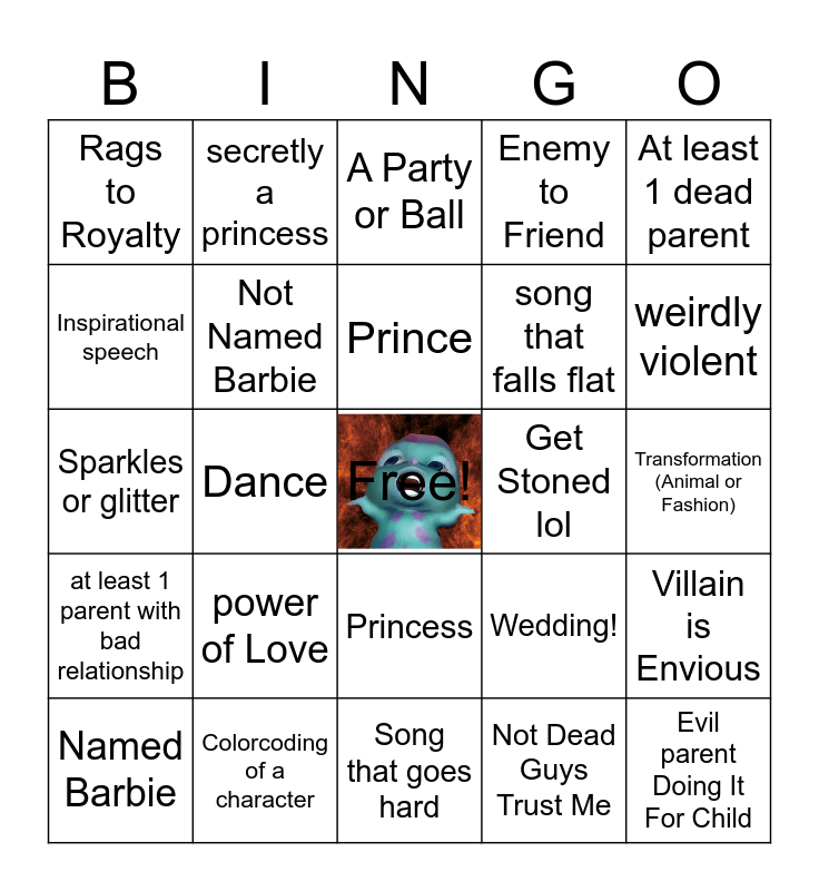 This bingo card has a free space and 39 words: Act of true love, nonblonde is rude or evil, “Adaption” of a story, Not Named Barbie, Named Barbie, Princess, Prince, The Chosen One, At least 1 dead parent, at least 1 parent with bad relationship, Dance, Enemy to Friend, Evil parent Doing It For Child, Transformation (Animal or Fashion), Get Stoned lol, power of Love, Story is told by Barbie, Rags to Royalty, Ken is robbed (monetarily or his spotlight), Wedding!, Inspirational speech, Song that goes hard, song that falls flat, weirdly violent, Pro-monarchy, Villain is defeated by own doing, “NO!!”, The three genders (Blonde, Brunette, Redhead), Goes Hard for No Reason, secretly a princess, Why Does It Talk, Oh My God I Hate This Thing (animal), A Party or Ball, Colorcoding of a character, Not Dead Guys Trust Me, You should be mad, Villain is Envious, Sparkles or glitter and plot twist.