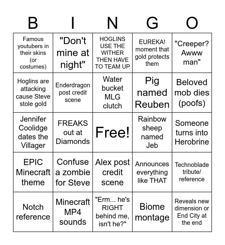 This bingo card has a free space and 24 words: Confuse a zombie for Steve, Minecraft MP4 sounds, Water bucket MLG clutch, Notch reference, "Creeper? Awww man", Famous youtubers in their skins (or costumes), Hoglins are attacking cause Steve stole gold, "Don't mine at night", Rainbow sheep named Jeb, Alex post credit scene, Pig named Reuben, Jennifer Coolidge dates the Villager, Announces everything like THAT, Technoblade tribute/ reference, Enderdragon post credit scene, Biome montage, Someone turns into Herobrine, HOGLINS USE THE WITHER THEN HAVE TO TEAM UP, Beloved mob dies (poofs), FREAKS out at Diamonds, Reveals new dimension or End City at the end, EPIC Minecraft theme, EUREKA! moment that gold protects them and "Erm... he's RIGHT behind me, isn't he?".