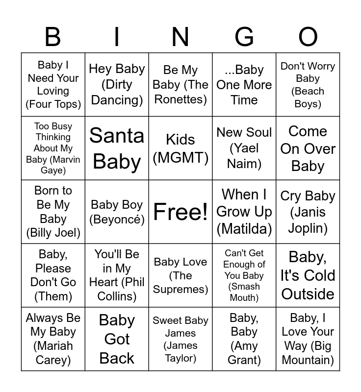 This bingo card has a free space and 30 words: Baby Got Back, Twist and Shout, Baby Boy (Beyoncé), Ice Ice Baby, Baby I Need Your Loving (Four Tops), Be My Baby (The Ronettes), Santa Baby, Baby Love (The Supremes), When I Grow Up (Matilda), Sweet Baby James (James Taylor), Cry Baby (Janis Joplin), Baby, I Love Your Way (Big Mountain), Baby, Baby (Amy Grant), Disco Inferno (The Trammps), Come On Over Baby, Baby Shark, Can't Get Enough of You Baby (Smash Mouth), Baby, Please Don't Go (Them), You'll Be in My Heart (Phil Collins), Don't Worry Baby (Beach Boys), Born to Be My Baby (Billy Joel), Christmas (Baby Please Come Home), Hey Baby (Dirty Dancing), New Soul (Yael Naim), Too Busy Thinking About My Baby (Marvin Gaye), ...Baby One More Time, Baby, It's Cold Outside, Always Be My Baby (Mariah Carey), Kids (MGMT) and I Got You Babe.