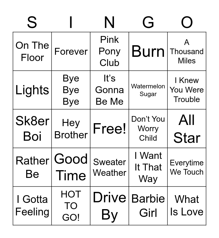 This bingo card has a free space and 80 words: Counting Stars, Evacuate The Dancefloor, Pink Pony Club, We Found Love, Dynamite, Blow, Applause, Just A Dream, Me And My Broken Heart, Whatche Say, Rocketeer, Tonight Tonight, Burn, On The Floor, Replay, Lights, Fireball, Good Time, Nothin’ on You, All Star, Complicated, A Thousand Miles, Sk8er Boi, It’s Gonna Be Me, Bye Bye Bye, Locked out of Heaven, Hot N Cold, Just Dance, Heaven, You Belong With Me, I Knew You Were Trouble, 22, Drive By, Can’t Hold Us, I Gotta Feeling, Don’t You Worry Child, Ride, Replay, Thunder, What Is Love, Count on Me, Rolling in the Deep, Meet Me Halfway, Pompeii, What Makes You Beautiful, Forever, Umbrella, Call Me Maybe, The Nights, Radioactive, Everytime We Touch, Hey Brother, I Want It That Way, Wake Me Up, Livin’ la Vida Loca, Paradise, Feel Good Inc., Cheerleader, Ridin’ Solo, Sweater Weather, Watermelon Sugar, With You, Born This Way, The Walker, Heart Attack, All Night, Classic, Just the Way You Are, Let’s Not Be Alone Tonight, Disturbia, Rather Be, HOT TO GO!, Love Don’t Cost A Thing, Drag Me Down, Pocketful of Sunshine, If We Ever Meet Again, Barbie Girl, Safe And Sound, Somebody That I Used To Know and Am I Wrong.