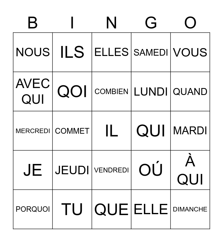 This bingo card has 25 words: JE, TU, IL, ELLE, VOUS, NOUS, ILS, ELLES, QUI, À QUI, AVEC QUI, QOI, QUE, OÚ, QUAND, PORQUOI, COMMET, COMBIEN, LUNDI, MARDI, MERCREDI, JEUDI, VENDREDI, SAMEDI and DIMANCHE.
