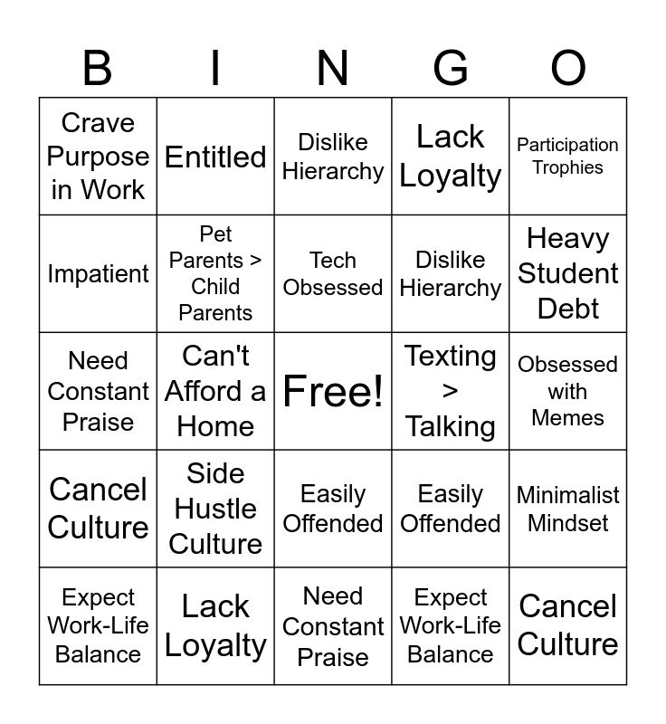 This bingo card has a free space and 72 words: Lazy, Entitled, Can't Afford a Home, Love Avocado Toast, Job-Hoppers, Texting > Talking, Lack Loyalty, Industry Killers, Dislike Hierarchy, Tech Obsessed, Expect Work-Life Balance, Bad with Money, Heavy Student Debt, Crave Purpose in Work, Impatient, Need Constant Praise, Easily Offended, Participation Trophies, Pet Parents > Child Parents, Obsessed with Memes, Side Hustle Culture, Cancel Culture, Minimalist Mindset, Casual & Informal, Lazy, Entitled, Can't Afford a Home, Love Avocado Toast, Job-Hoppers, Texting > Talking, Lack Loyalty, Industry Killers, Dislike Hierarchy, Tech Obsessed, Expect Work-Life Balance, Bad with Money, Heavy Student Debt, Crave Purpose in Work, Impatient, Need Constant Praise, Easily Offended, Participation Trophies, Pet Parents > Child Parents, Obsessed with Memes, Side Hustle Culture, Cancel Culture, Minimalist Mindset, Casual & Informal, Lazy, Entitled, Can't Afford a Home, Love Avocado Toast, Job-Hoppers, Texting > Talking, Lack Loyalty, Industry Killers, Dislike Hierarchy, Tech Obsessed, Expect Work-Life Balance, Bad ith Money, Heavy Student Debt, Crave Purpose in Work, Impatient, Need Constant Praise, Easily Offended, Participation Trophies, Pet Parents > Child Parents, Obsessed with Memes, Side Hustle Culture, Cancel Culture, Minimalist Mindset and Caal & Informal.
