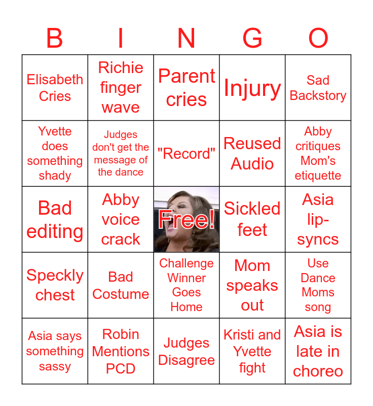 This bingo card has a free space and 26 words: Challenge Winner Goes Home, Kristi and Yvette fight, "Record", Robin Mentions PCD, Sad Backstory, Elisabeth Cries, Yvette does something shady, Richie finger wave, Asia lip- syncs, Mom speaks out, Reused Audio, Bad editing, Use Dance Moms song, Asia says something sassy, Abby voice crack, Abby Nasal/Mickey Mouse Voice, Injury, Speckly chest, Parent cries, Asia is late in choreo, Abby critiques Mom's etiquette, Judges Disagree, Sickled feet, Bad Costume, Judges don't get the message of the dance and Mom yells at their kid.