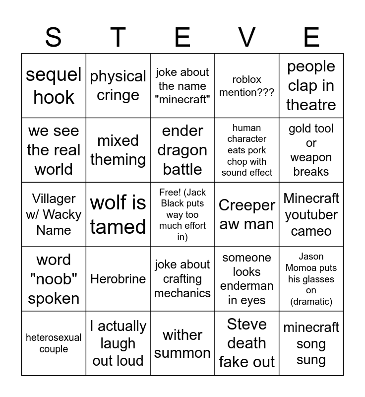 This bingo card has a free space and 24 words: Herobrine, I actually laugh out loud, ender dragon battle, heterosexual couple, people clap in theatre, sequel hook, we see the real world, physical cringe, Creeper aw man, joke about crafting mechanics, human character eats pork chop with sound effect, Villager w/ Wacky Name, someone looks enderman in eyes, Jason Momoa puts his glasses on (dramatic), mixed theming, Steve death fake out, Minecraft youtuber cameo, joke about the name "minecraft", gold tool or weapon breaks, wolf is tamed, minecraft song sung, word "noob" spoken, roblox mention??? and wither summon.