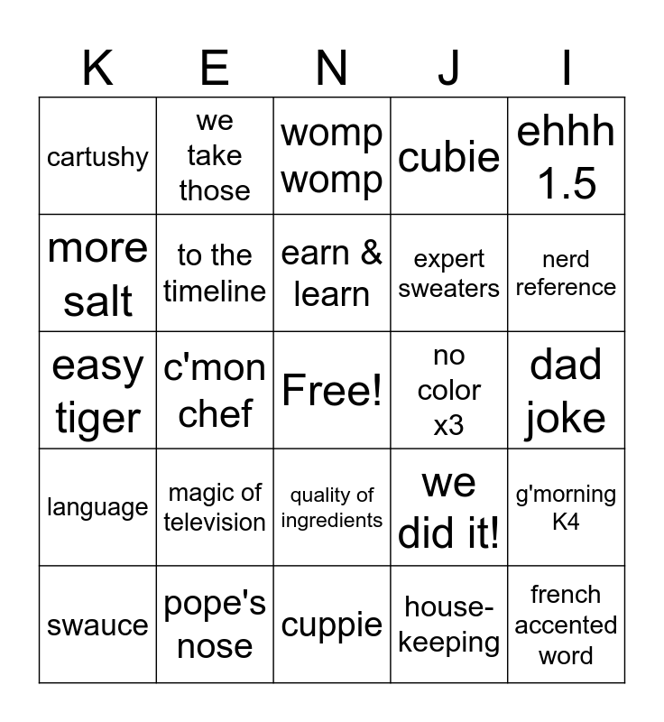This bingo card has a free space and 24 words: magic of television, pope's nose, earn & learn, swauce, ehhh 1.5, cartushy, more salt, we take those, no color x3, quality of ingredients, expert sweaters, easy tiger, we did it!, g'morning K4, to the timeline, house-keeping, dad joke, womp womp, nerd reference, c'mon chef, french accented word, language, cubie and cuppie.